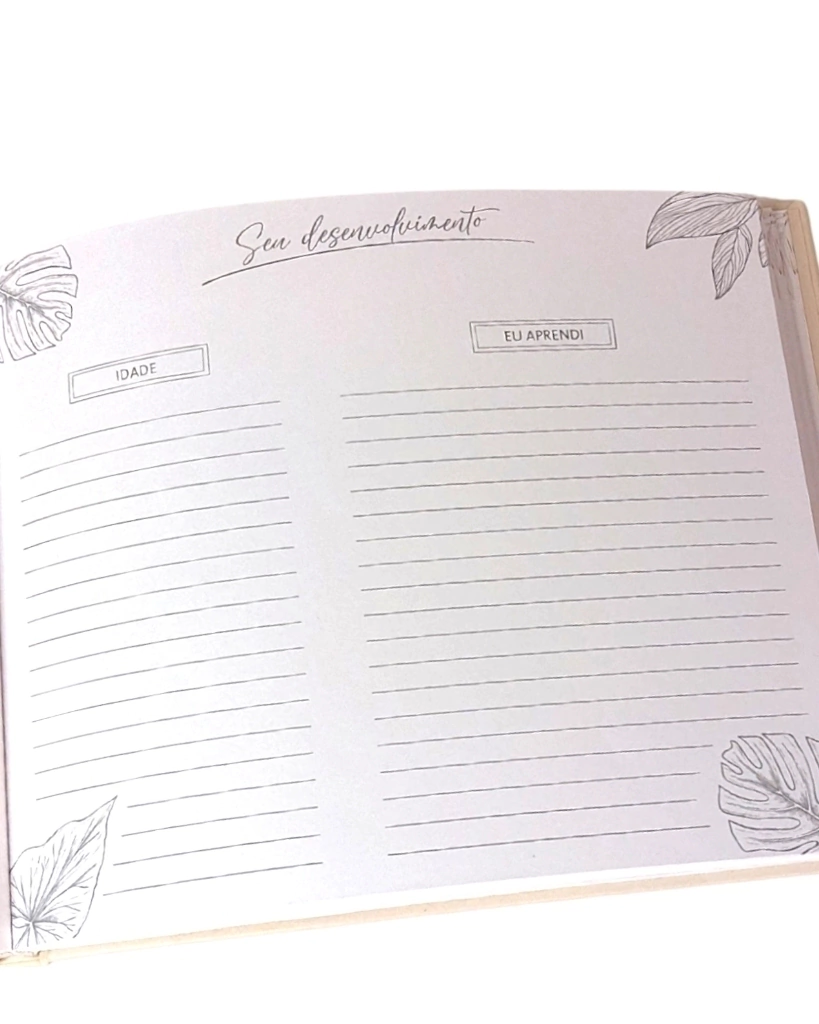 Acompanhamento Mês a Mês: Do 1º ao 12º mês, acompanhe cada fase com páginas duplas para fotos, anotações sobre peso, medidas e as novas descobertas.